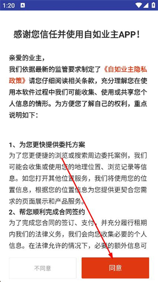 1、打開(kāi)自如業(yè)主app,在彈出的頁(yè)面,點(diǎn)擊同意按鈕。