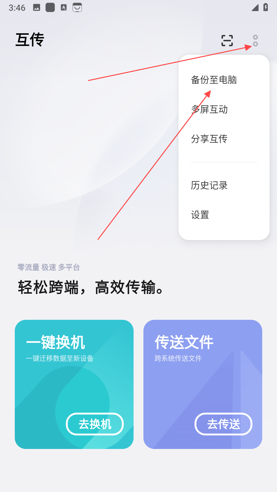 1、打開手機(jī)上的互傳應(yīng)用,點(diǎn)擊主界面右上角的三點(diǎn)圖標(biāo),在彈出的菜單中選擇備份至電腦選項(xiàng)。