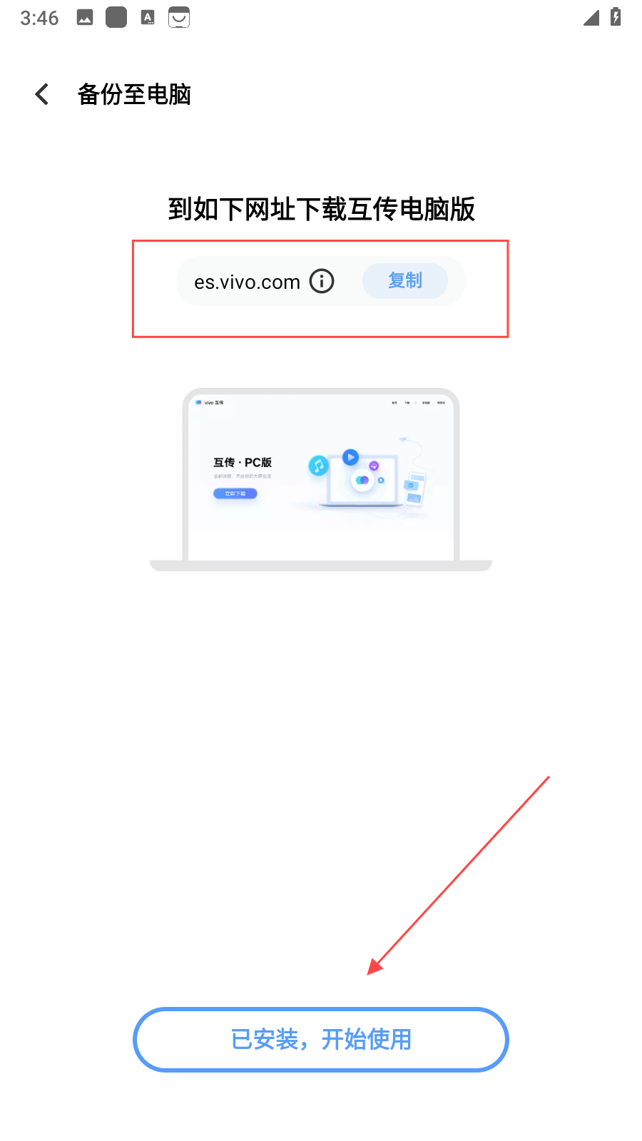 2、若電腦未安裝互傳電腦版,點(diǎn)擊頁面中顯示網(wǎng)址es.vivo.com,進(jìn)行復(fù)制后,在電腦瀏覽器打開該網(wǎng)址并下載安裝互傳電腦版,若已安裝,直接點(diǎn)擊已安裝,開始使用。