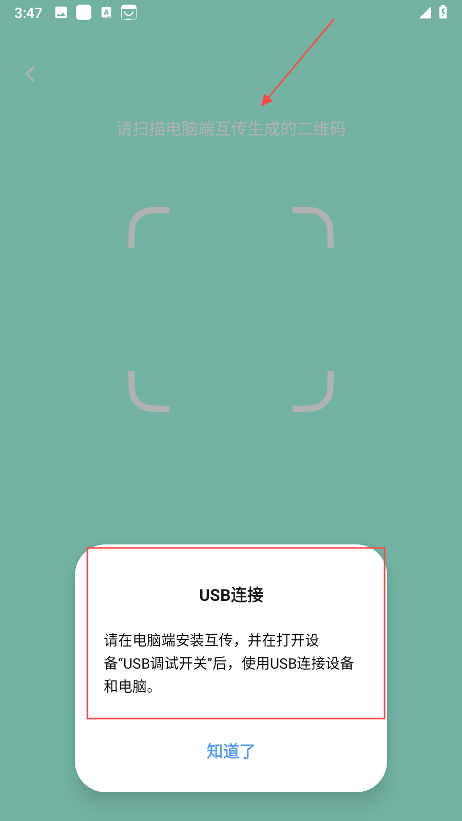3、打開電腦端的互傳應(yīng)用,在手機(jī)端互傳中,出現(xiàn)掃描界面后,掃描電腦端互傳生成的二維碼,建立連接,也可以使用USB數(shù)據(jù)線連接手機(jī)和電腦,按照提示選擇要備份的數(shù)據(jù)。