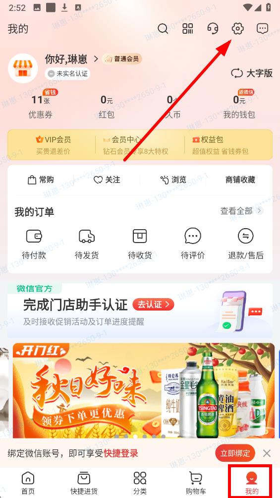 1、打開易久批APP,點擊底部導航欄中的我的選項進入個人頁面,右上角,點擊設置圖標進入。