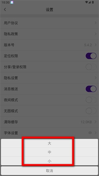 4、在字體大小選擇界面,可選擇大、中、小字號,選擇后即可完成字體大小設(shè)置。