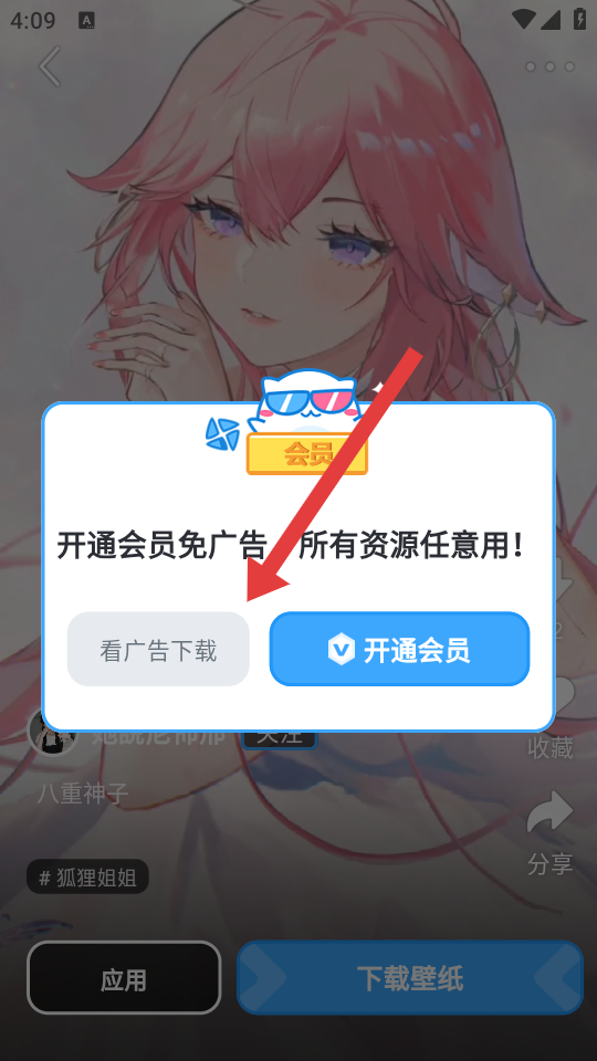 2、在壁紙詳情界面,點擊底部藍(lán)色的下載壁紙按鈕,觸發(fā)會員提示彈窗。