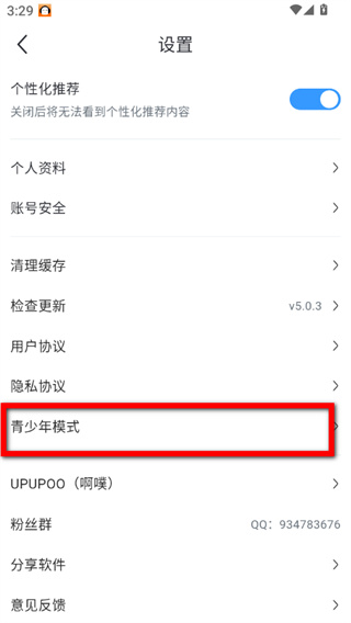 3、在設(shè)置頁面,點擊青少年模式選項,進(jìn)入青少年模式設(shè)置界面即可開啟。