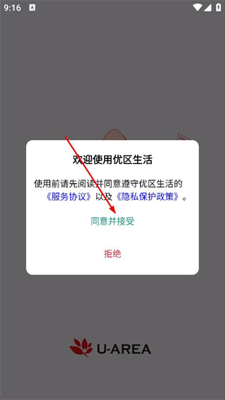 1、打開優(yōu)區(qū)生活,在彈出的窗口中,點(diǎn)擊同意并接受。