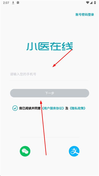 1、打開小醫(yī)在線APP,在登錄頁(yè)面輸入手機(jī)號(hào)碼,勾選服務(wù)協(xié)議及隱私政策,點(diǎn)擊下一步。