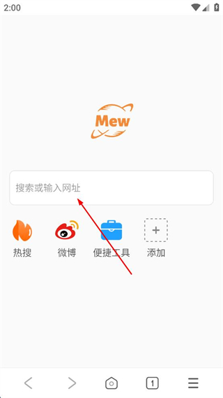 1、打開Mew瀏覽器,點擊搜索或輸入網(wǎng)址框。