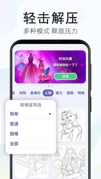 開心涂色提供了二十多種類別、上千張不同的圖片供你選擇,每張圖片都精妙絕倫,你一定能夠在里面找到一張你喜歡的圖片,逐步上色,使其變得色彩鮮艷,同時,在手指不斷敲擊屏幕的過程中,壓力也能一點(diǎn)點(diǎn)釋放出去了。
