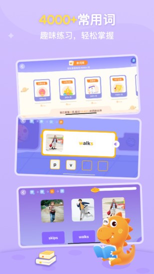 4000+單詞庫專項練習(xí),對標(biāo)國內(nèi)教學(xué)要求。含108啟蒙必備詞、220高頻詞、300+小學(xué)必備、1000+KET詞庫、2000+PET詞庫。2000+拓展詞庫。通過“學(xué)、練、認(rèn)”科學(xué)學(xué)習(xí)路徑設(shè)計,讓兒童牢記4000+必備詞。
