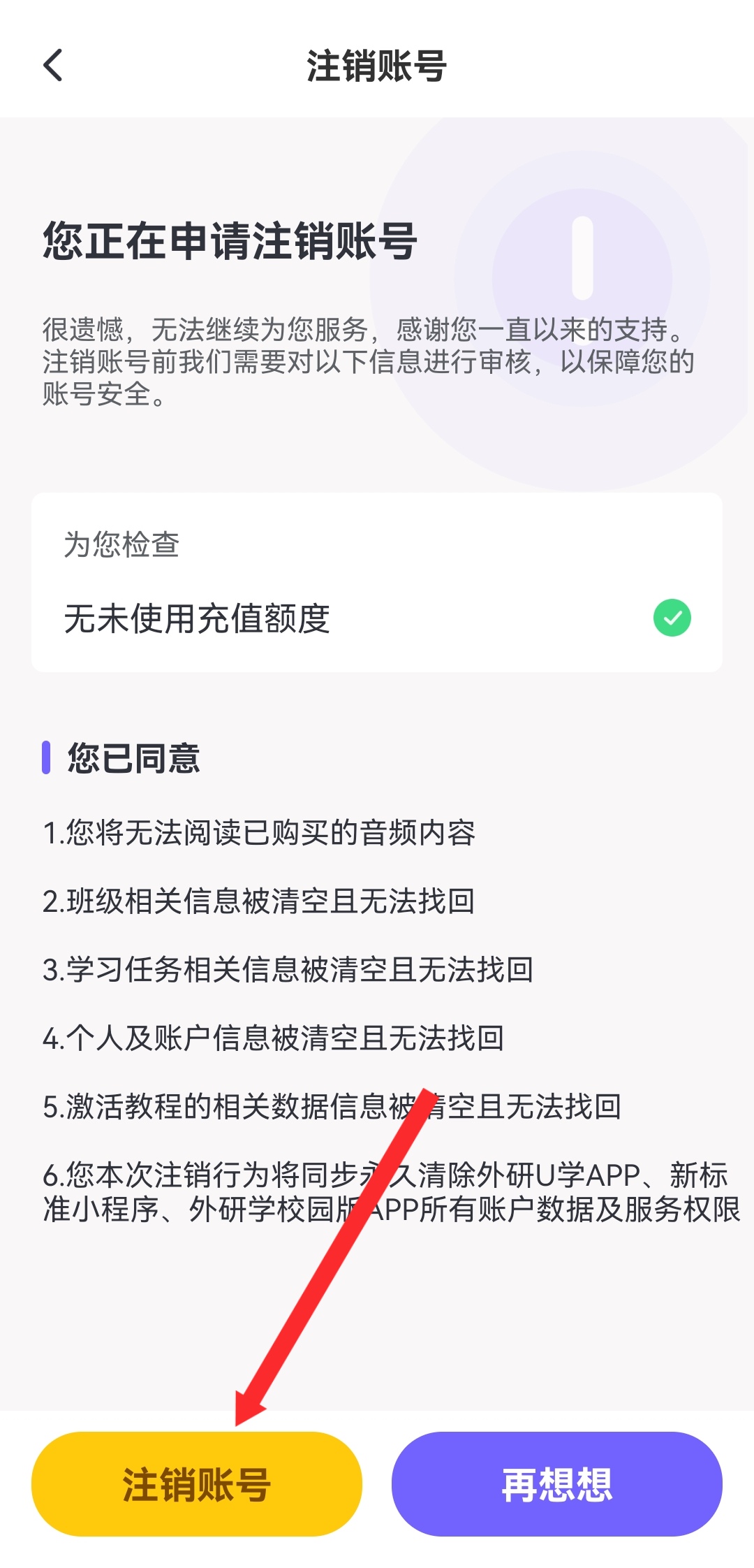 4、在注銷賬號頁面,點擊注銷賬號按鈕,完成賬號注銷操作。