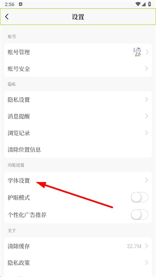 3、在設(shè)置界面里,點(diǎn)擊字體設(shè)置選項(xiàng),進(jìn)入字體設(shè)置頁(yè)面。