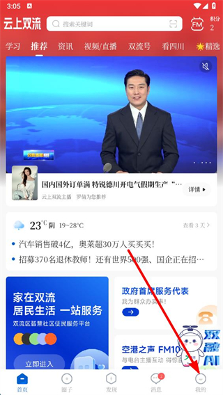 1、打開(kāi)云上雙流app,點(diǎn)擊底部導(dǎo)航欄中的我的選項(xiàng)。