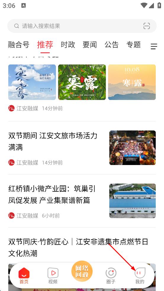 2、在江安融媒首頁,點(diǎn)擊右下角我的,進(jìn)入個人頁面。