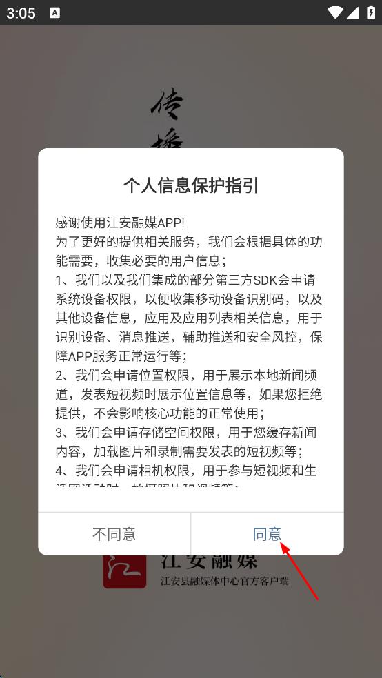 1、打開江安融媒,在彈出的個人信息保護(hù)指引頁面,點(diǎn)擊同意,進(jìn)入江安融媒首頁。