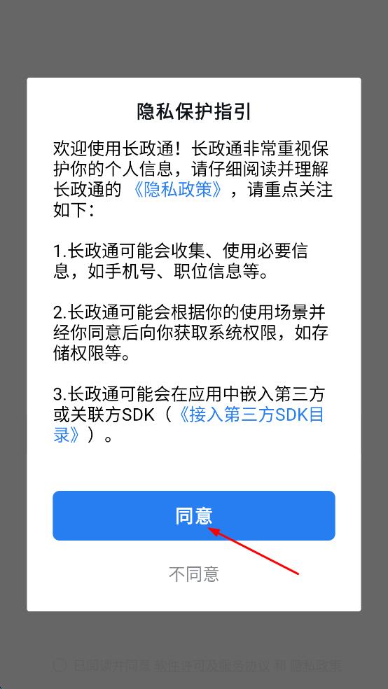 1、打開(kāi)長(zhǎng)政通,會(huì)出現(xiàn)隱私保護(hù)指引界面,仔細(xì)閱讀后點(diǎn)擊“同意”。