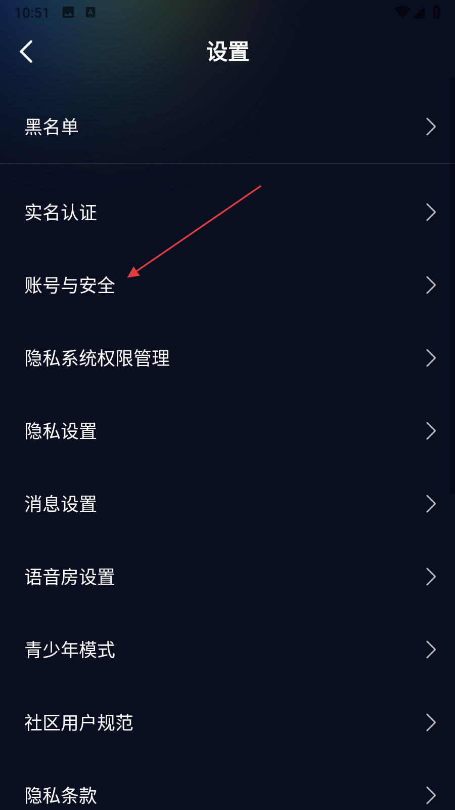 2、在設(shè)置界面中,找到賬號與安全選項并點擊,進入賬號與安全頁面。