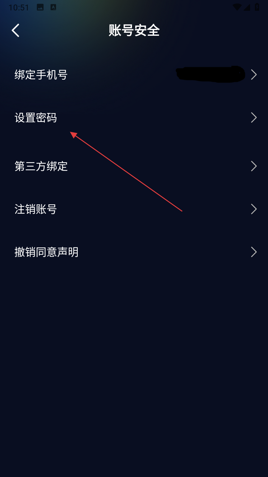 3、在賬號與安全頁面里,點擊設(shè)置密碼選項,進入設(shè)置密碼頁面。