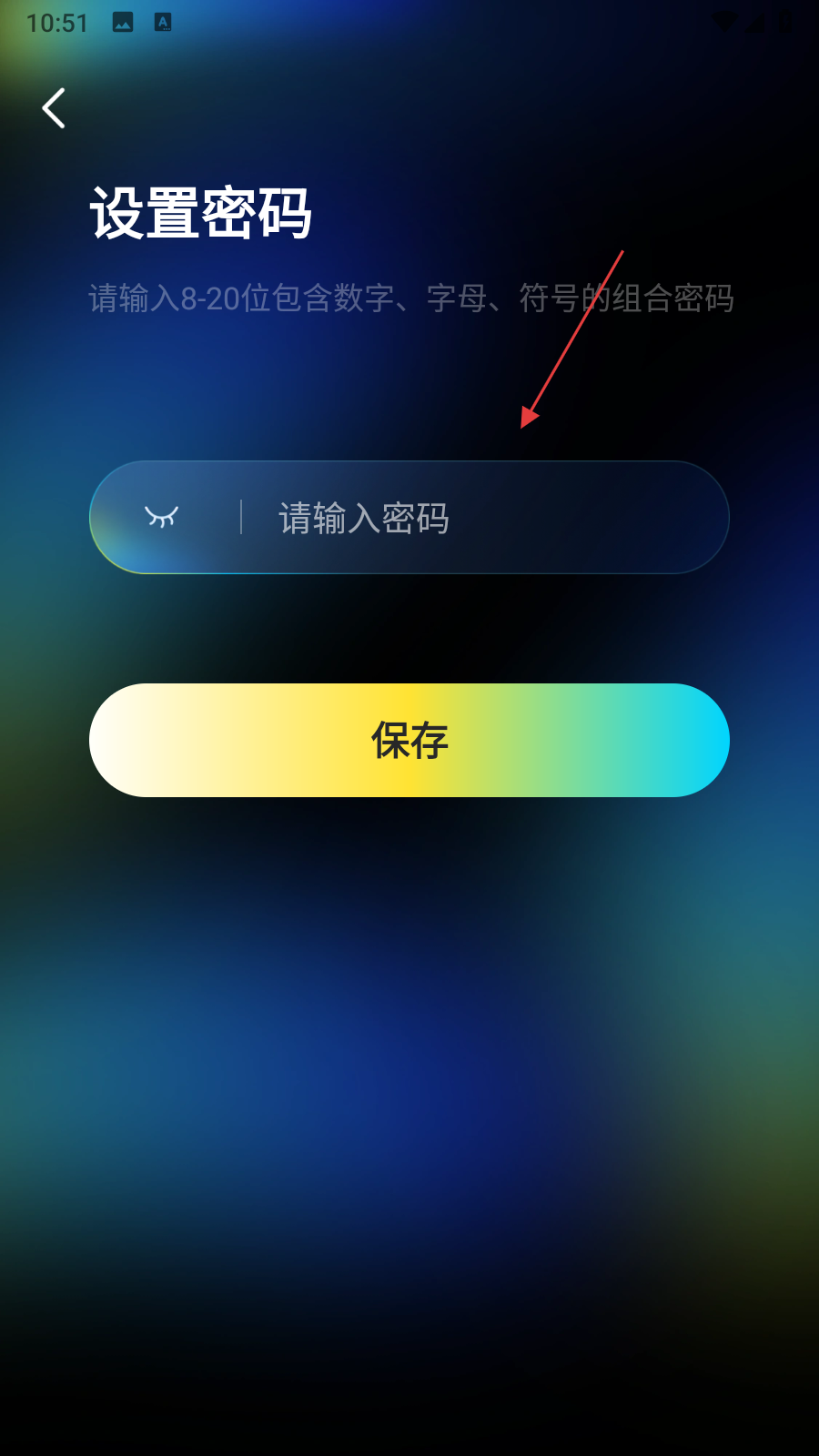 4、在設(shè)置密碼頁面中,輸入8-20位包含數(shù)字、字母、符號的組合密碼,輸入完成后點擊保存。