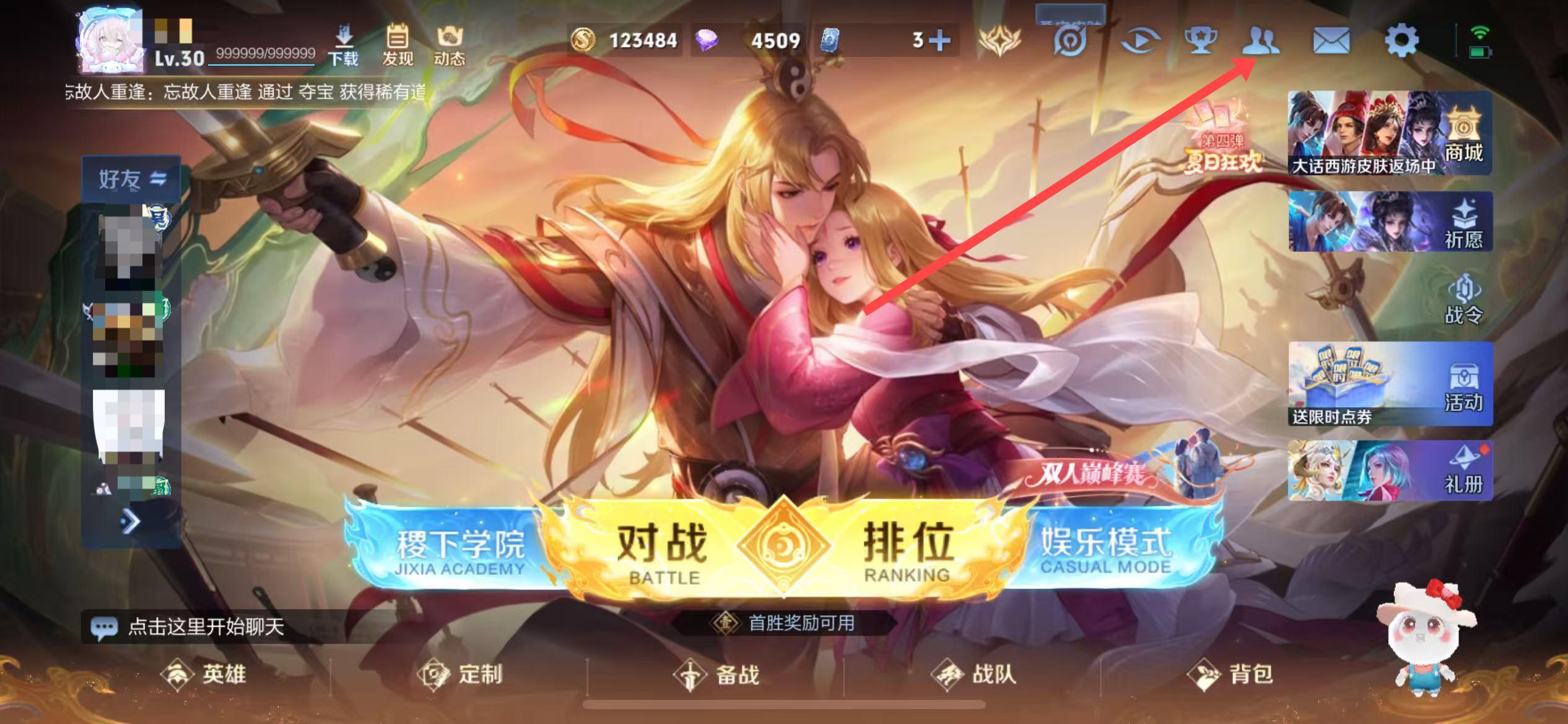 1、打開王者榮耀云游戲,進入游戲主界面,點擊界面上方的好友圖標,進入游戲關(guān)系界面。