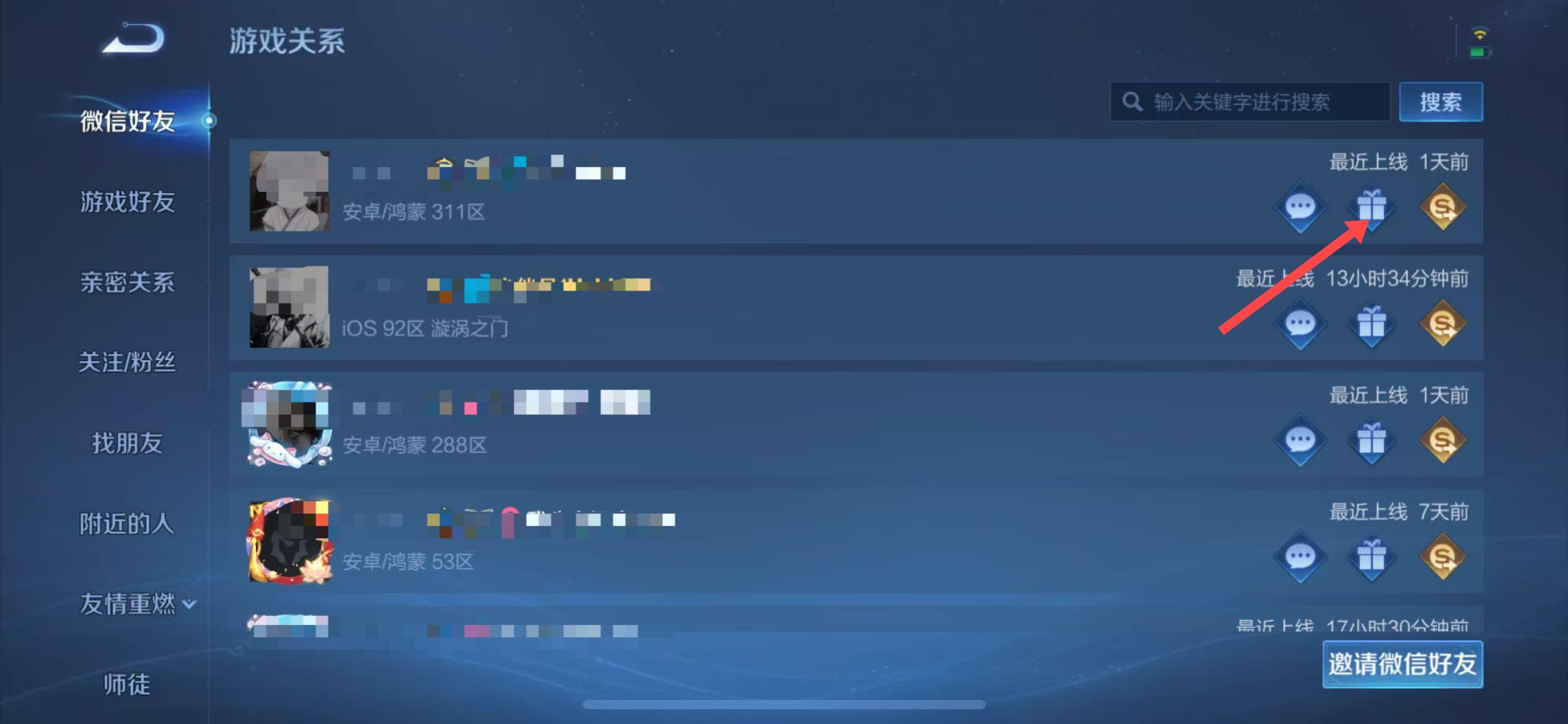 2、在游戲關(guān)系界面,選擇想要贈送皮膚的好友,點擊其信息欄右側(cè)的禮物圖標。
