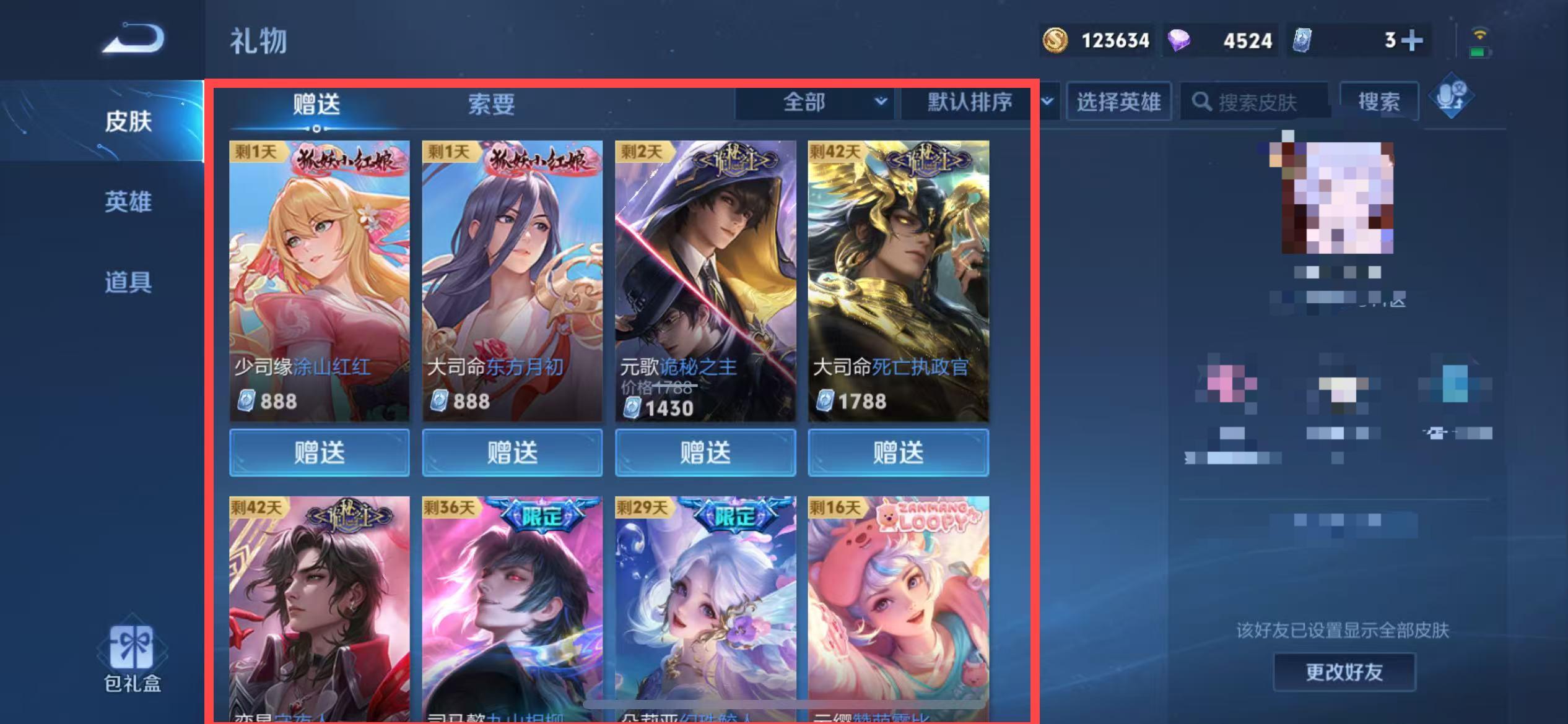 3、點擊左側(cè)的皮膚選項,選擇想要贈送的皮膚,點擊皮膚下方的贈送按鈕,按照提示完成支付等操作。