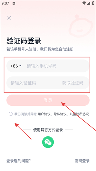 3、輸入手機(jī)號(hào)、驗(yàn)證碼,勾選同意用戶協(xié)議、隱私協(xié)議、兒童隱私協(xié)議,點(diǎn)擊登錄。