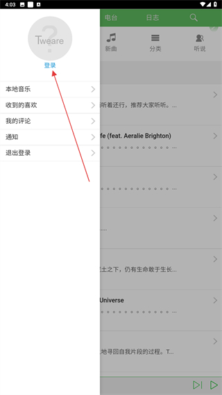 2、在左側彈出的頁面內,點擊登錄的按鈕。