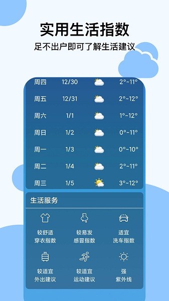 1、生活指數(shù)功能:搜索你想了解的城市,會(huì)得到多方面的生活指數(shù)提示;