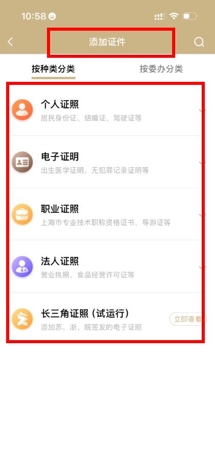 4、在添加證件頁(yè)面,可按種類(lèi)分類(lèi)選擇需要添加的證件類(lèi)型,然后按提示完成添加操作。