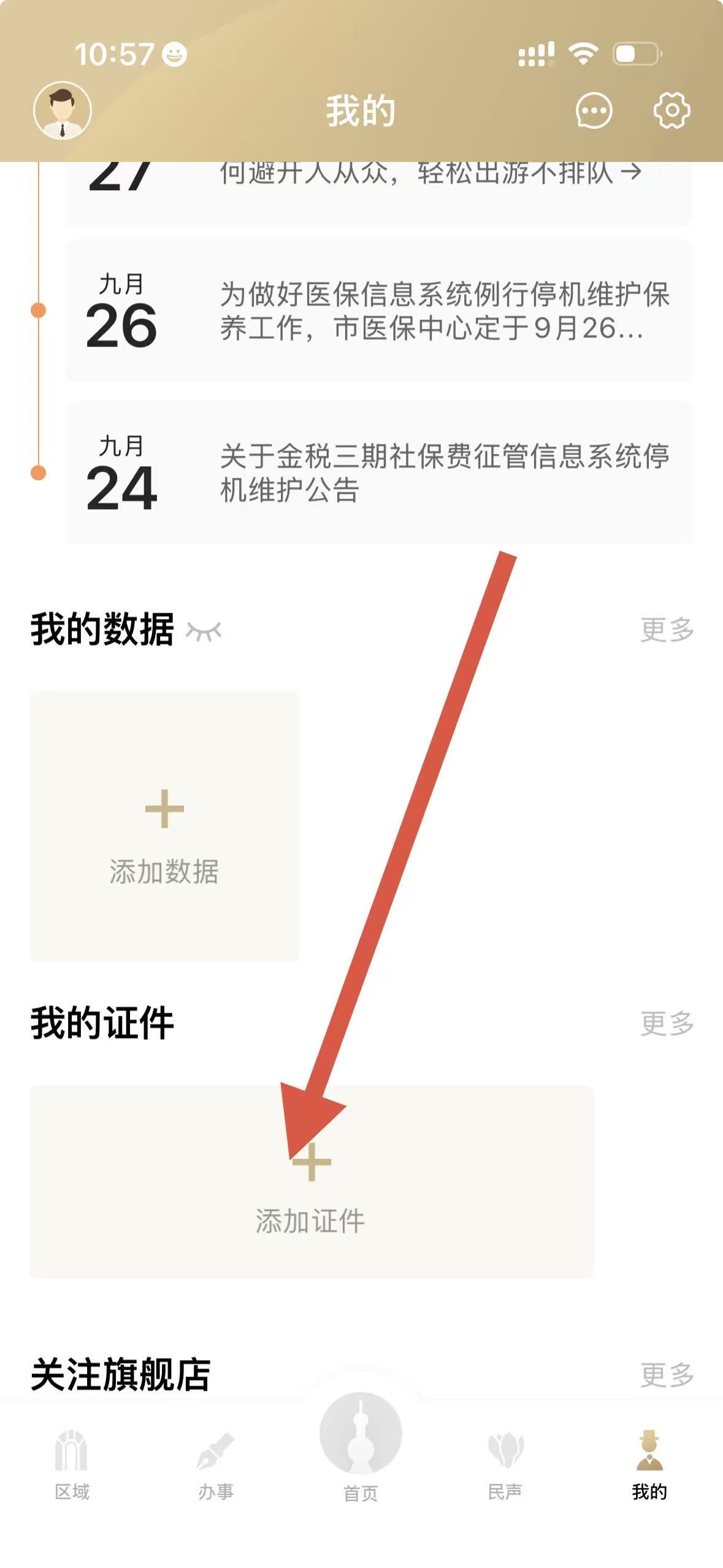 2、在個(gè)人界面中,找到我的證件板塊,點(diǎn)擊其中的添加證件按鈕。