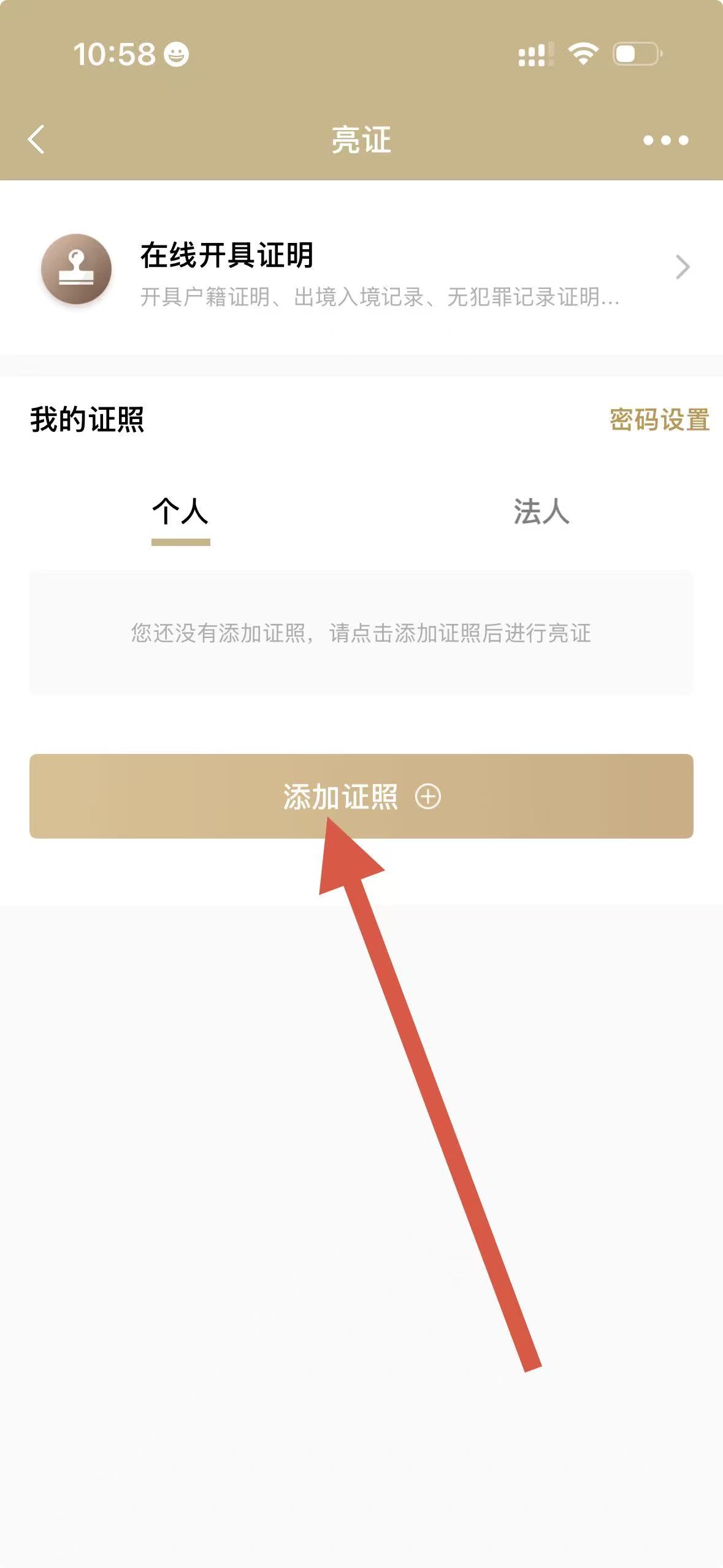 3、進(jìn)入亮證界面后,再次點(diǎn)擊添加證照選項(xiàng)。