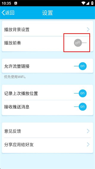 4、將其從on切換為off,即可關(guān)閉播放前奏聲音。