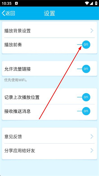 3、找到播放前奏選項,點擊其右側(cè)的開關(guān)按鈕。