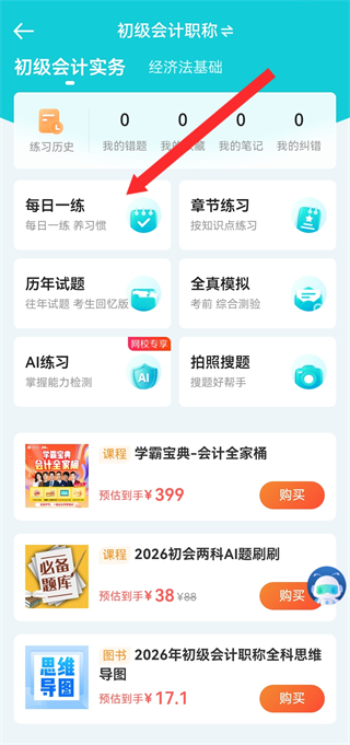 2、在初級(jí)會(huì)計(jì)職稱練習(xí)頁面,點(diǎn)擊每日一練,進(jìn)入每日練習(xí)設(shè)置頁面。