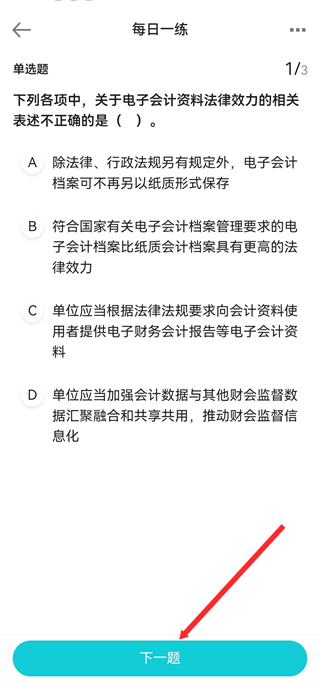 4、在題目作答的頁面,完成題目后點(diǎn)擊下一題,繼續(xù)進(jìn)行練習(xí)操作。