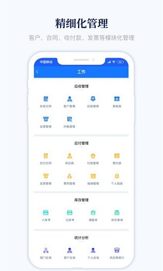 管理合同、收款、付款、發(fā)票、費(fèi)用報(bào)銷、審批流程等。