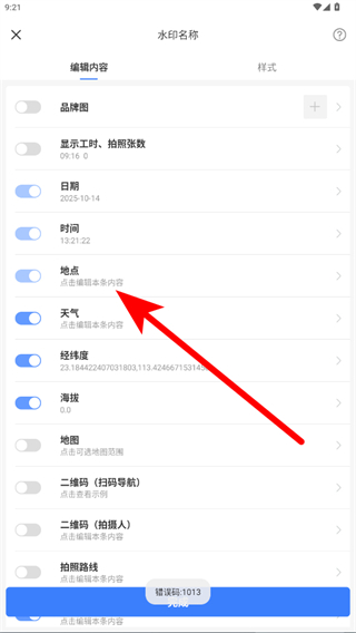 2、在水印編輯頁(yè)面中,找到并點(diǎn)擊地點(diǎn)選項(xiàng)。