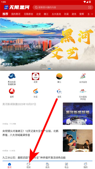 1、打開無限黑河APP,點擊底部導(dǎo)航欄中的視頻選項,進(jìn)入視頻頁面。