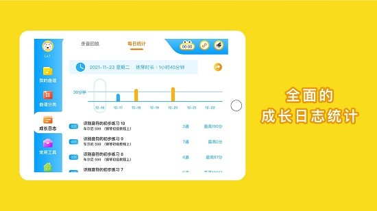 小白練琴app可以幫助用戶輕松練琴,海量的曲譜任你選擇,各種分類應(yīng)有盡有,統(tǒng)計每天的練習(xí)時間。小白練琴陪練神器還可以將練習(xí)的數(shù)據(jù)記錄下來,各項信息一目了然,專屬節(jié)拍器與調(diào)音器隨便用。