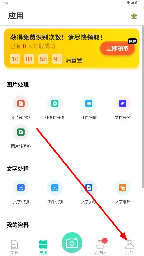 1、打開全能掃描王APP,點擊底部導(dǎo)航欄最右側(cè)我的進(jìn)入個人界面。