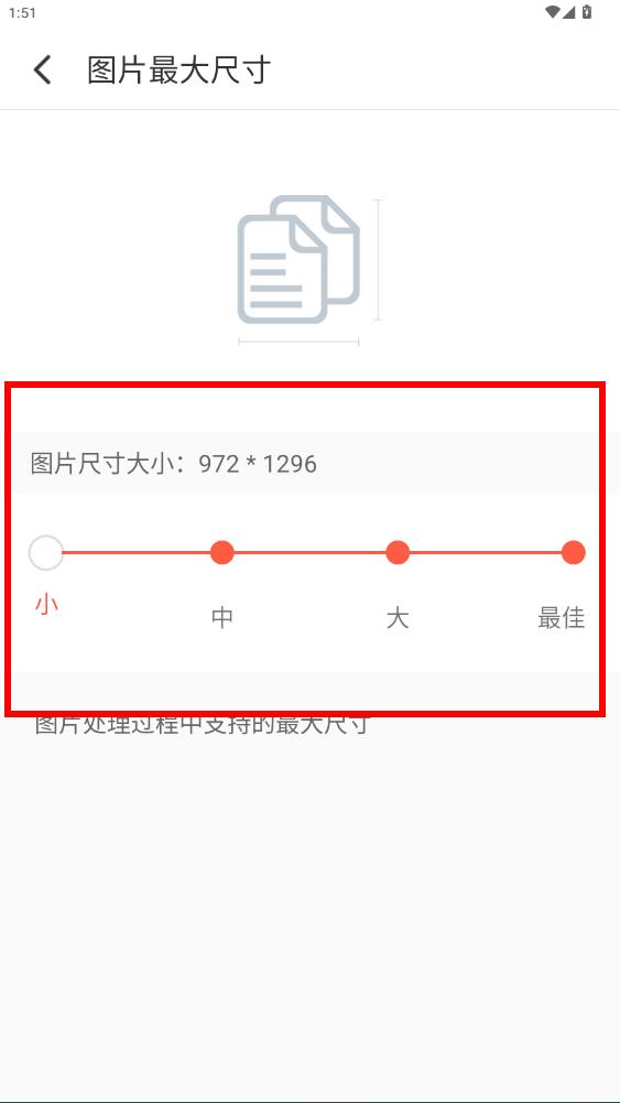 4、在圖片最大尺寸設(shè)置界面,通過滑動下方滑軌選擇不同圖片尺寸規(guī)格完成設(shè)置。