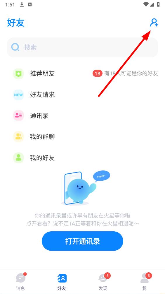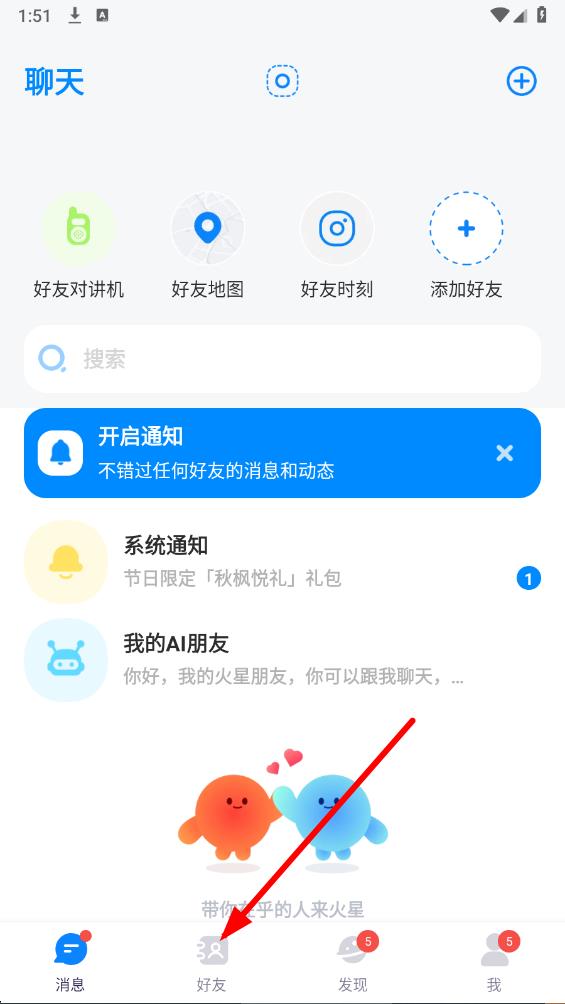 1、打開火星APP,進(jìn)入聊天界面,點(diǎn)擊底部導(dǎo)航欄中的好友圖標(biāo)。
