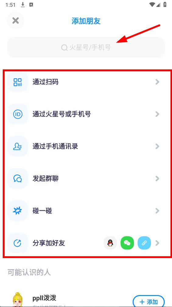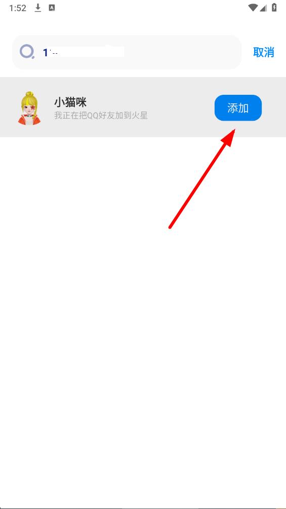 4、在搜索框輸入對(duì)方火星號(hào)或手機(jī)號(hào),找到對(duì)應(yīng)好友后,點(diǎn)擊其右側(cè)的添加按鈕,等待對(duì)方通過即可。