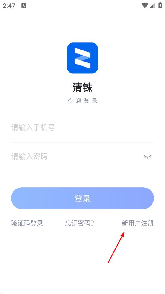 1、打開清銖APP,進(jìn)入登錄頁面,點(diǎn)擊“新用戶注冊”選項(xiàng)。