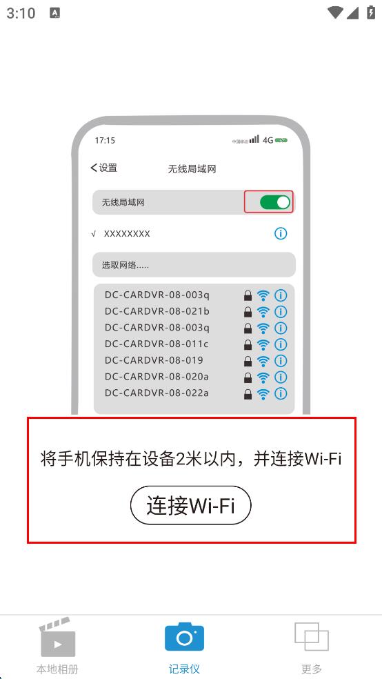 2、點擊“連接記錄儀”按鈕,進入連接準備界面,按照提示,將手機保持在設備2米以內,然后找到“連接Wi-Fi”按鈕并點擊。