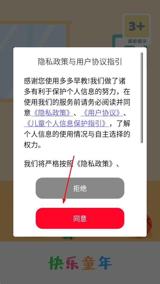1、打開多多早教APP,在彈出的隱私政策與用戶協(xié)議指引頁(yè)面,點(diǎn)擊同意。