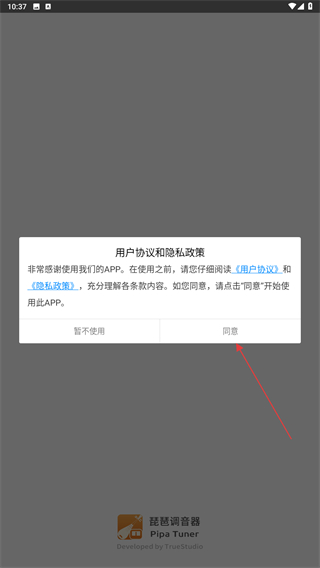 1、啟動(dòng)琵琶調(diào)音器的應(yīng)用軟件,進(jìn)入時(shí)會(huì)跳出用戶協(xié)議和隱私政策,點(diǎn)擊同意的按鈕。