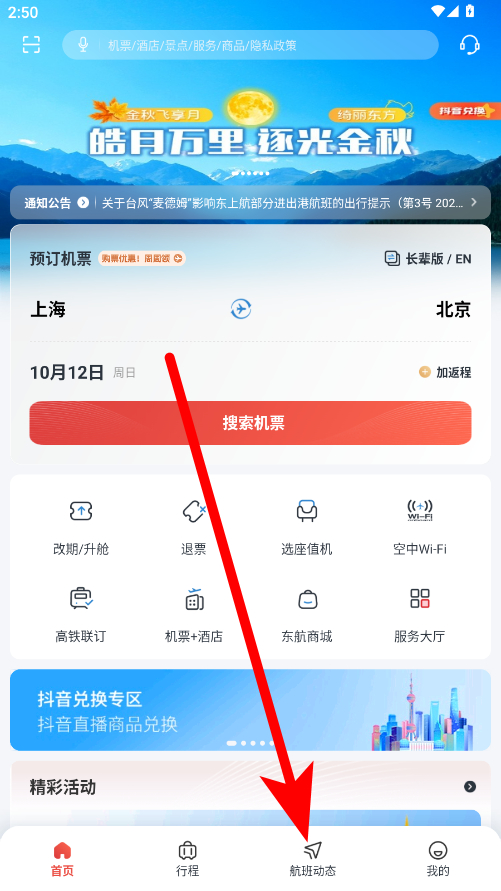 1、打開東方航空App,點(diǎn)擊底部菜單欄中的航班動態(tài)選項(xiàng)。