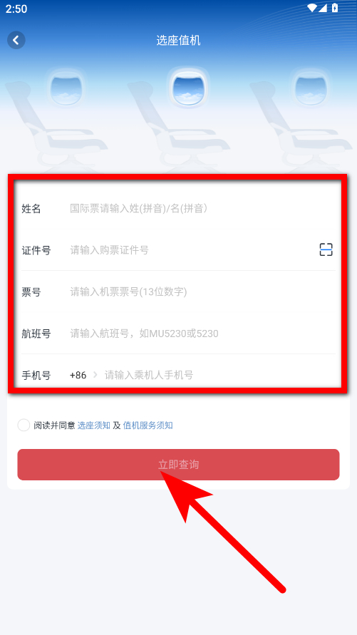 3、在選座值機(jī)頁面,輸入相關(guān)信息,勾選同意后,點(diǎn)擊立即查詢,完成值機(jī)選座操作。