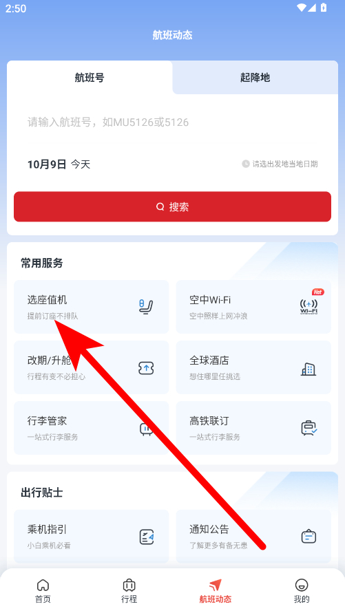 2、在航班動態(tài)頁面,找到常用服務(wù)板塊,點(diǎn)擊其中的選座值機(jī)。